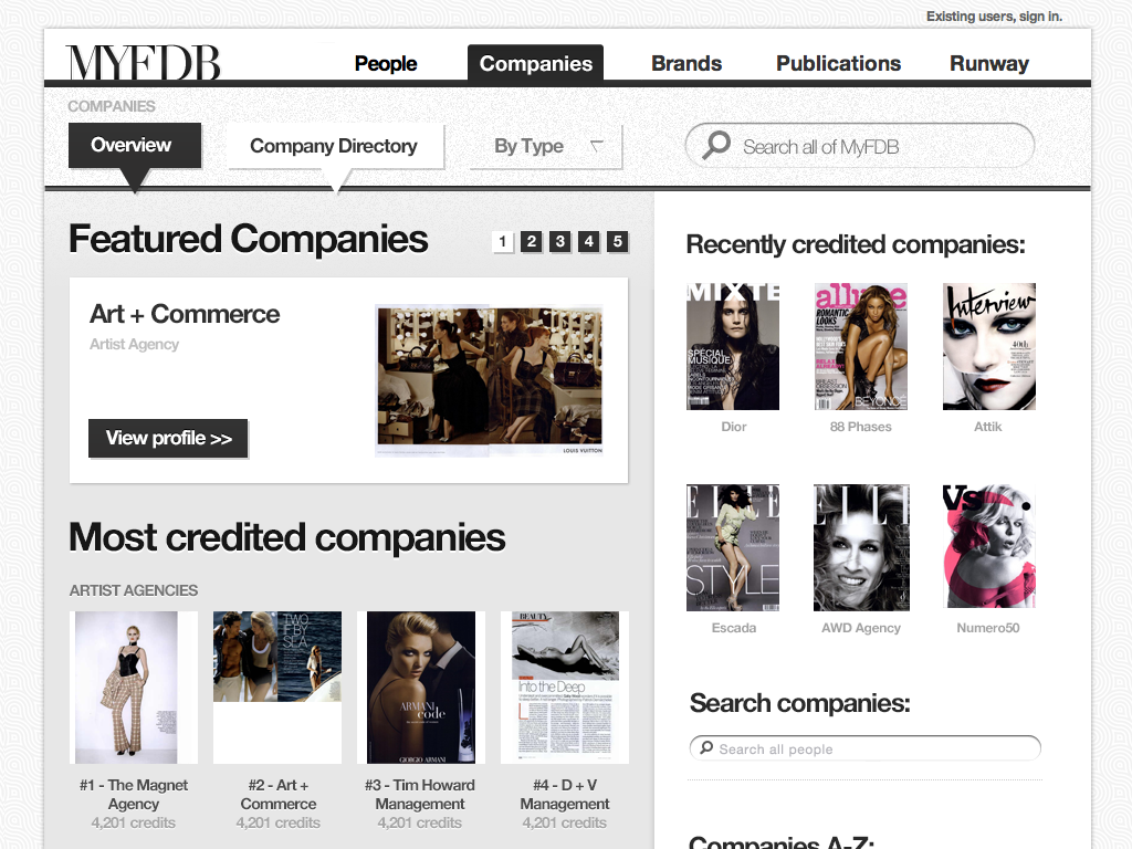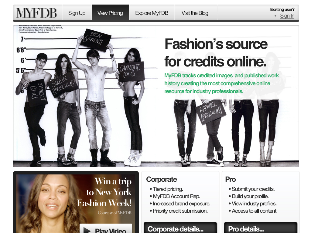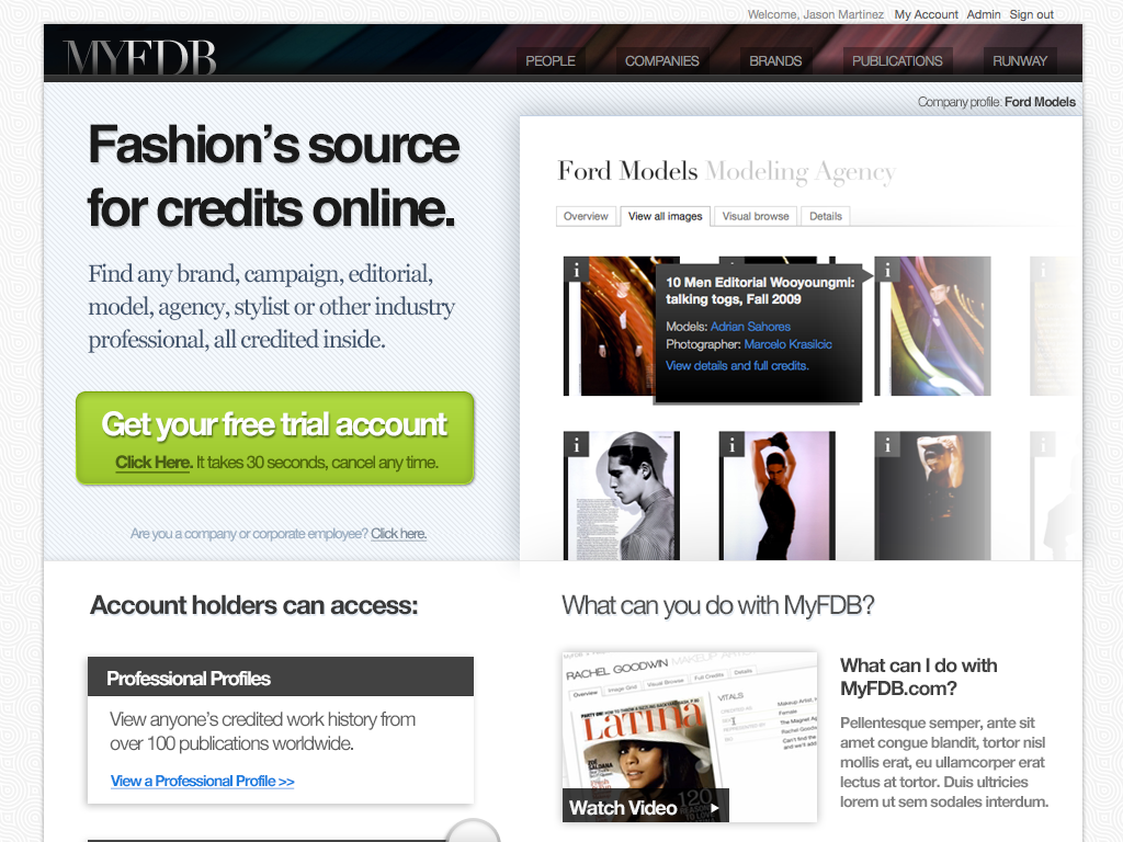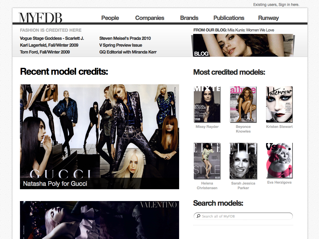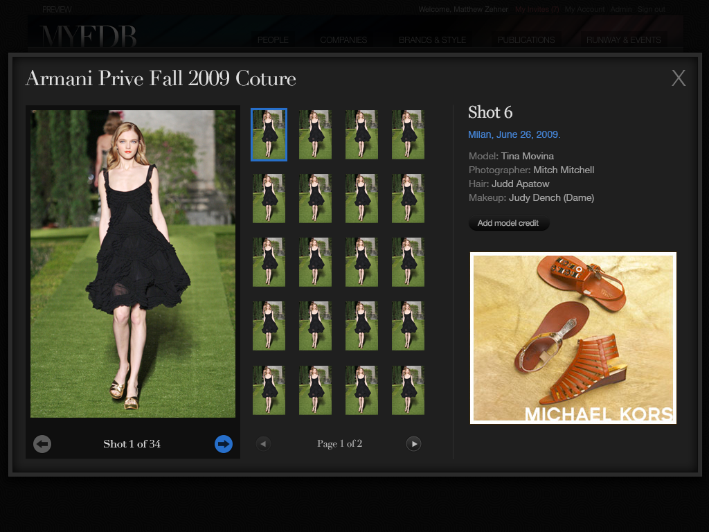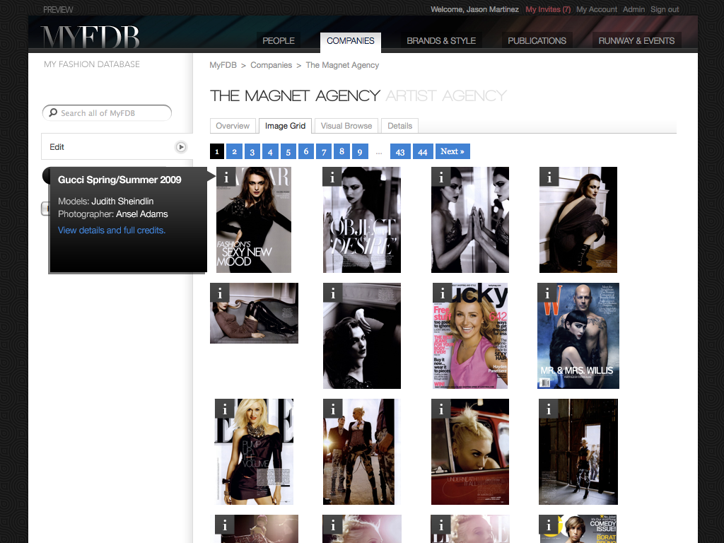 "The IMDB of Fashion" was the original tag-line for this startup. My involvement started with the first prototype through the first production release and through the sale of the company. I coordinated design and development teams while being only producer of design assets and front-end code. The site cataloged tens of thousands of models and fashion professions, thousands of companies and all the meta-data available for them. Partnerships with BCBG, Max Azria and others lead to a successful investment and sale of the company to a Tokyo based fashion industry venture capital firm.