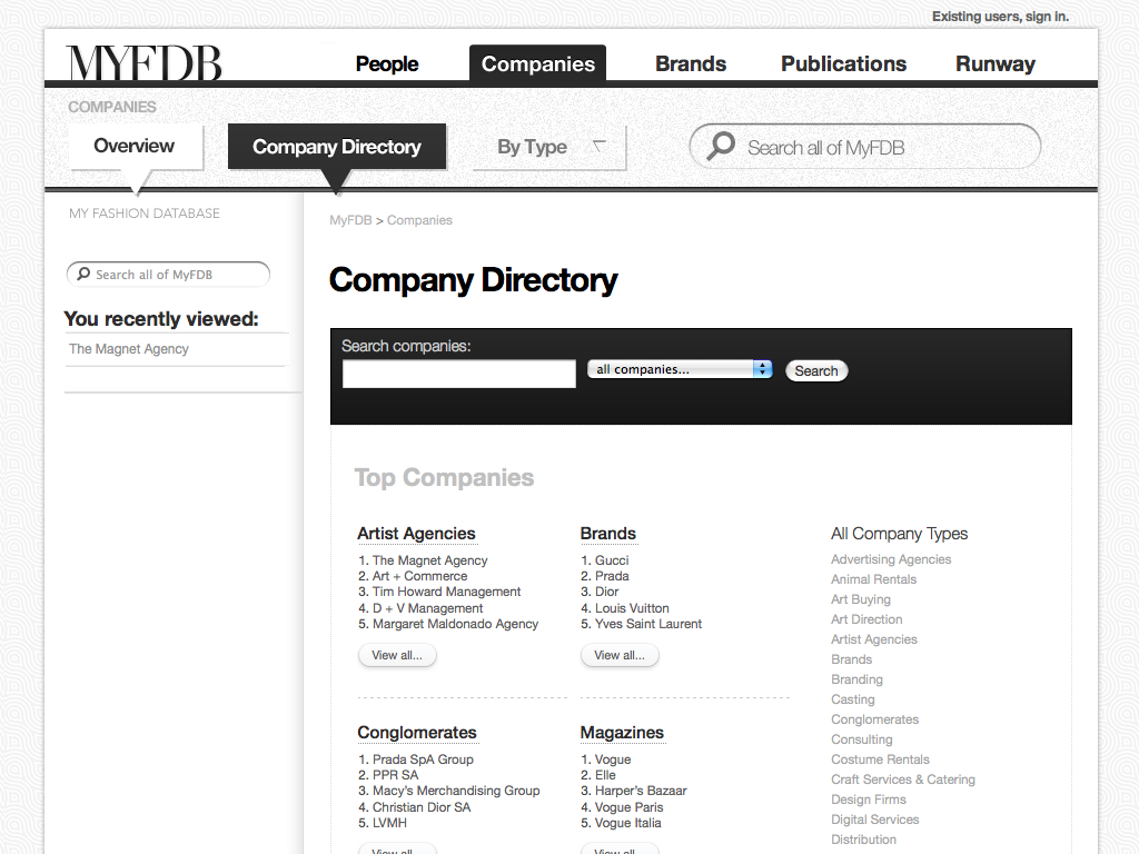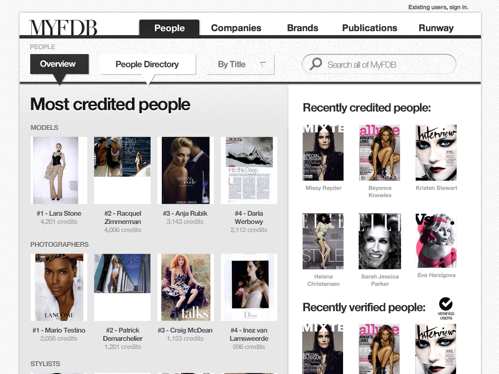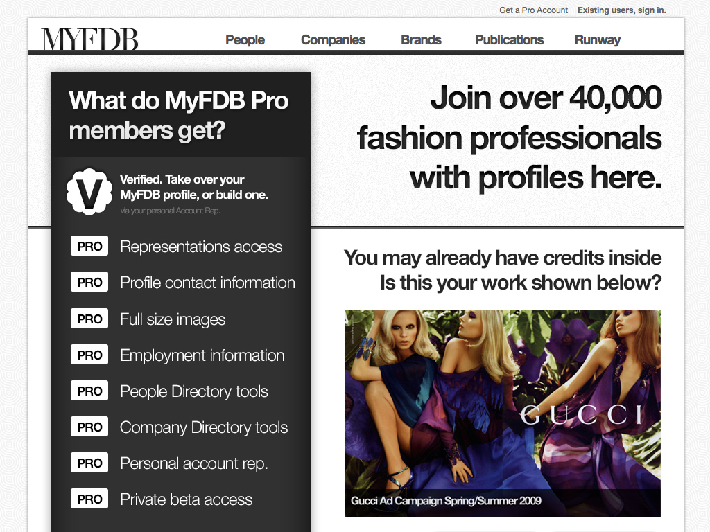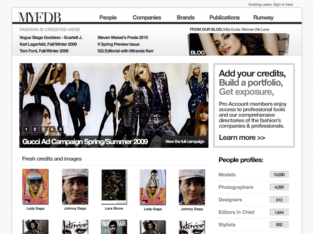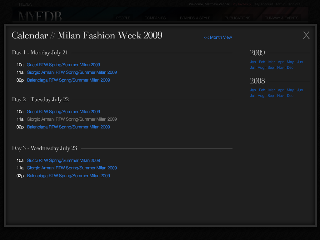 "The IMDB of Fashion" was the original tag-line for this startup. My involvement started with the first prototype through the first production release and through the sale of the company. I coordinated design and development teams while being only producer of design assets and front-end code. The site cataloged tens of thousands of models and fashion professions, thousands of companies and all the meta-data available for them. Partnerships with BCBG, Max Azria and others lead to a successful investment and sale of the company to a Tokyo based fashion industry venture capital firm.