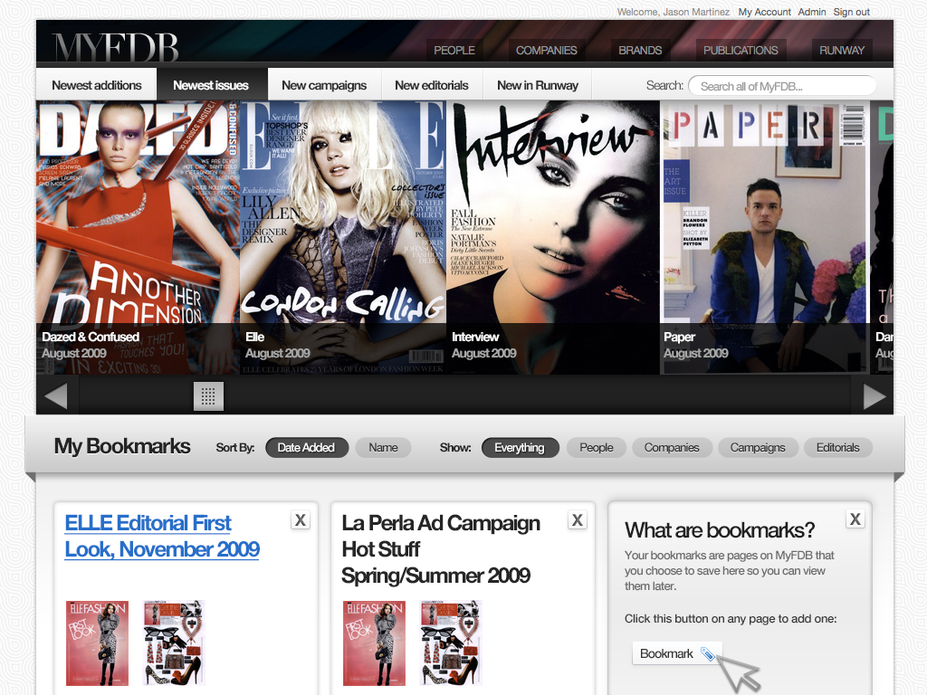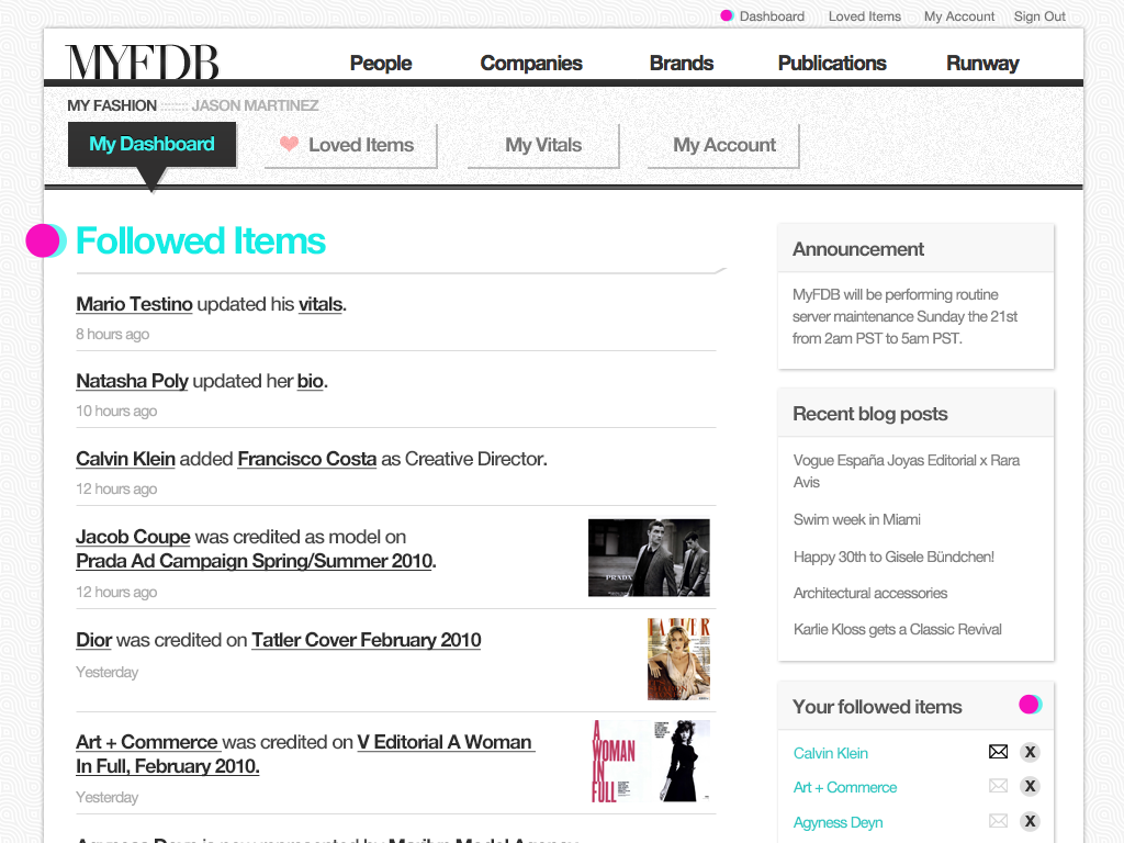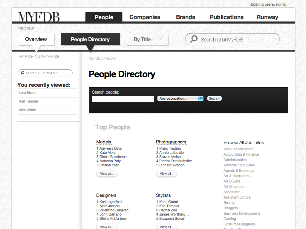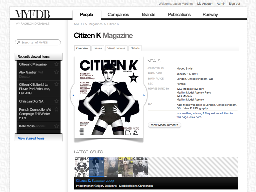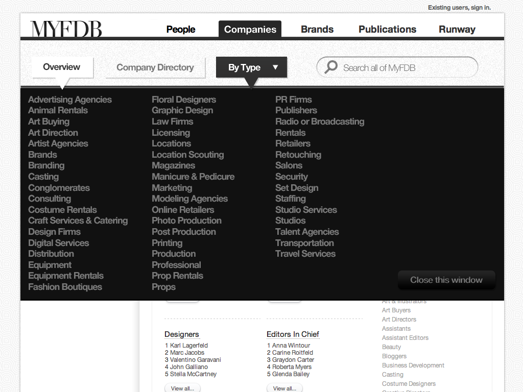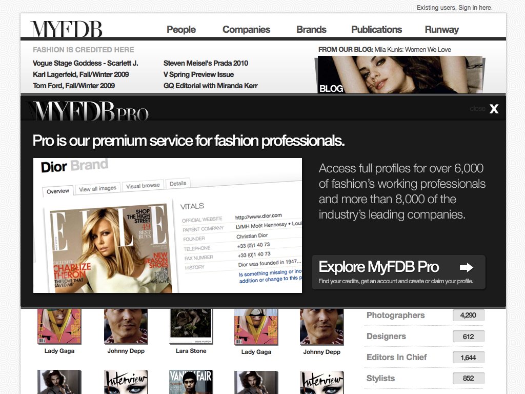 "The IMDB of Fashion" was the original tag-line for this startup. My involvement started with the first prototype through the first production release and through the sale of the company. I coordinated design and development teams while being only producer of design assets and front-end code. The site cataloged tens of thousands of models and fashion professions, thousands of companies and all the meta-data available for them. Partnerships with BCBG, Max Azria and others lead to a successful investment and sale of the company to a Tokyo based fashion industry venture capital firm.
