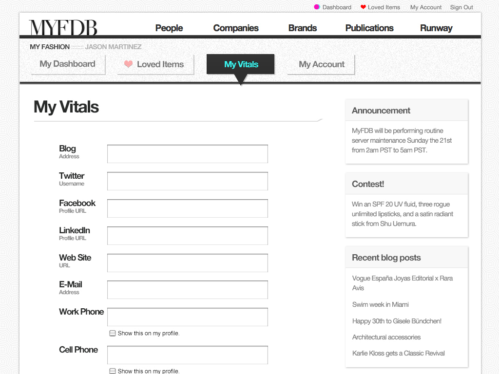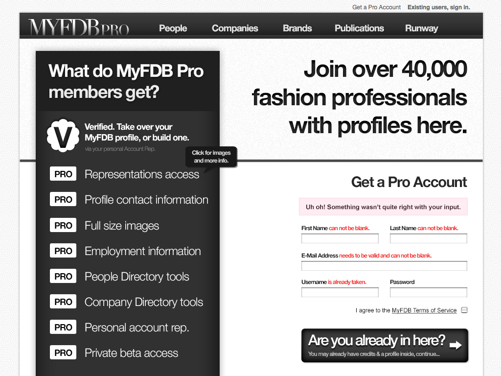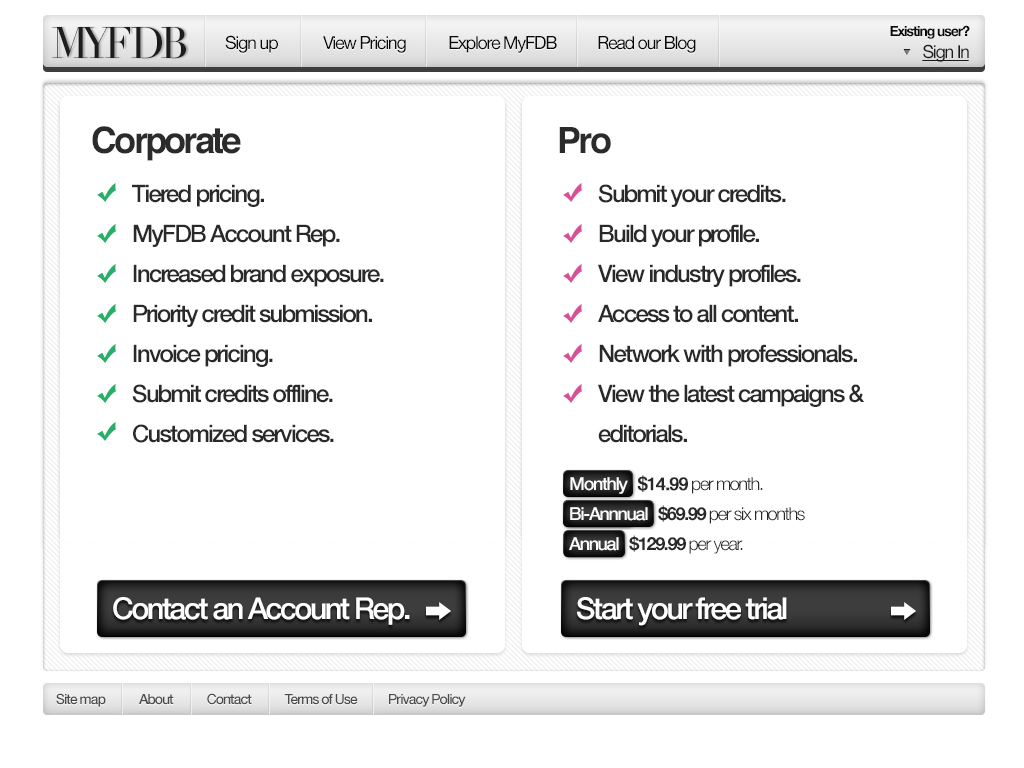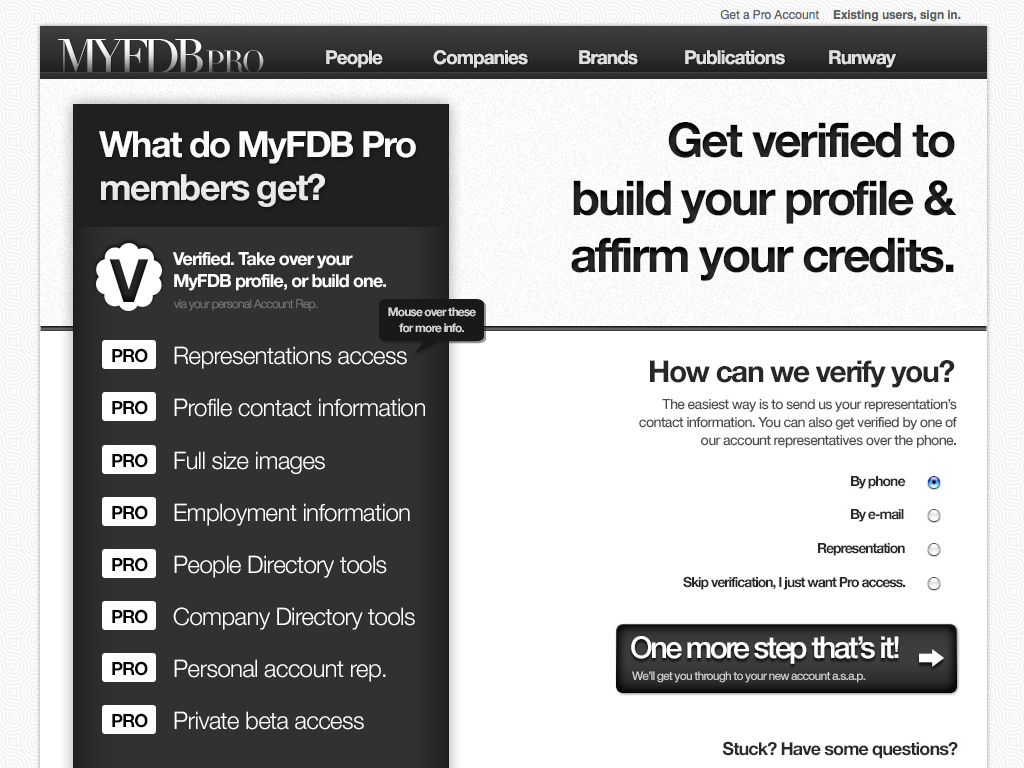 The second major version of MyFDB.com. I lead design and development through a major re-write and redesign adding a verification funnel similar to how Twitter operates their identification verification process and deeply integrated analytics that proved very useful for new sales/leads.
